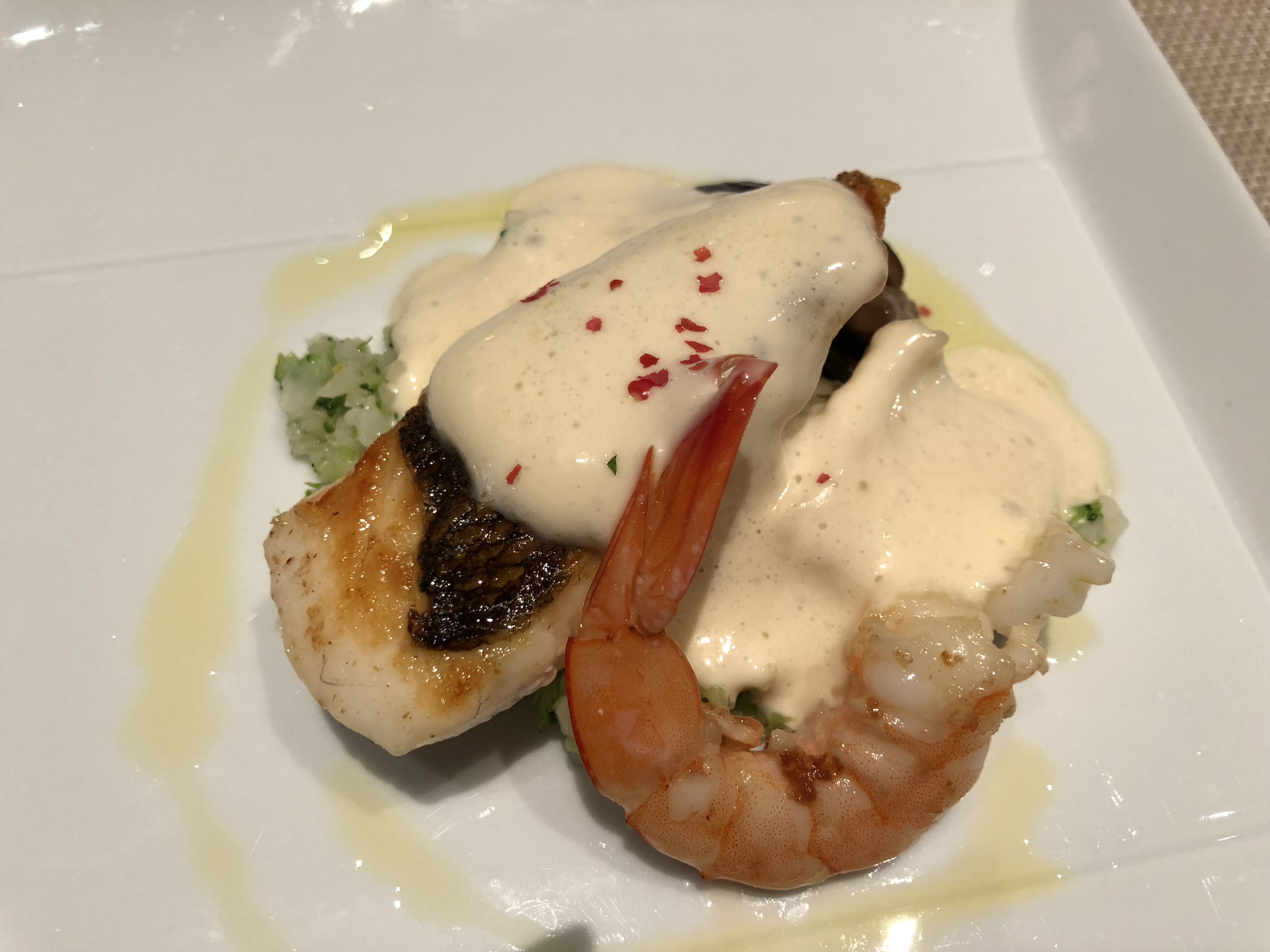 grilled prawn, fish with caviar